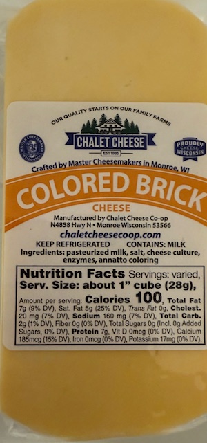 Brick cheese is a Wisconsin original, semi-soft cheese, made from pasteurized cows milk, cheese cultures, salt, enzymes and annatto coloring!Â